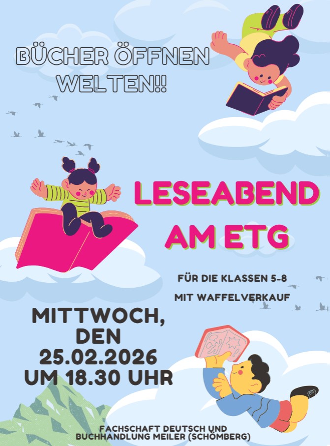 Wir laden alle Schülerinnen und Schüler der Klassen 5 bis 8 sowie ihre Familien herzlich zu unserem Leseabend am ETG ein.