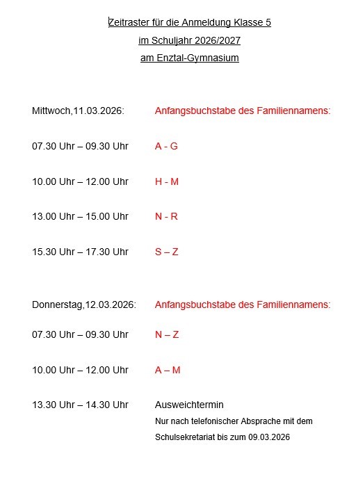 Die Anmeldung von Schülerinnen und Schülern aus der 4. Klasse zur Aufnahme in das Enztal-Gymnasium ist in diesem Jahr zu folgenden Zeiten vorgesehen: